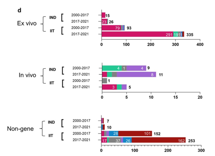 据公开数据显示,全球CGT大多数处于早期研发阶段(包括临床前研究和临床Ⅰ期),CGT市场处于萌芽期。我国开展的CGT临床试验数量目前位居全球第二,临床开发热情高涨。为进一步拓展这个领域,国家从十三五到十四五期间出台了很多政策与CGT相关的治疗原则,旨在加快产业发展。