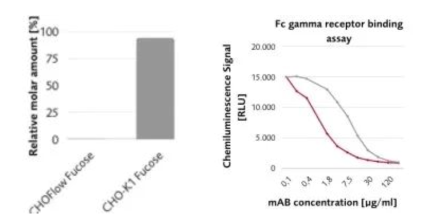 除已有的CHOzen®细胞系和GLYCOEXPRESS® (GEX®)细胞系外,汉腾生物新推出的岩藻糖基转移酶8敲除的CHO细胞系,可赋予重组表达的单抗无岩藻糖修饰的特性。该细胞系在产量和生长与野生型CHO K1一致的条件下,无岩藻糖抗体与FcγRs抗原亲和力提高,ADCC效应加强。