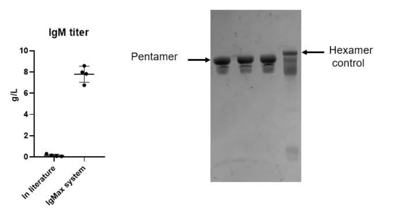 汉腾生物具备高表达IgM的经验,经过载体系统改进及生产工艺的优化后可提高lgM表达量,最高可达8g/L。其中,IgMaxTM表达载体平台和IgMasterTM工艺平台是汉腾生物自主研发的IgM相关开发平台,其具备了高产量、高纯度和高效价的特点,技术转移路线清晰,可满足大规模生产的需求。此外,理化分析、生化分析、制剂开发和生产能力也均配套完善,可有效解决IgM的产业化难题。