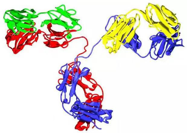多种免疫球蛋白结构域构成了抗体的两条重链(红色和蓝色部分),以及两条轻链(绿色和黄色)。这些结构域包含7次(恒定区)及9次(变化区)的β折叠。可发生变化的部分称为V区(或变化区、可变区),而不变的部分称为C区(或恒定区)。